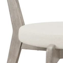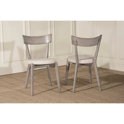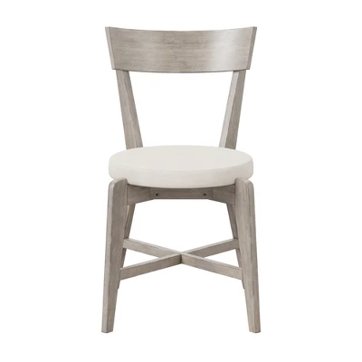 - The classic gray dining chairs feature an arched slat back with Fog Gray round upholstered seats
