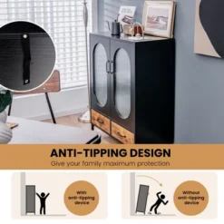 - High-quality Material & Stable Structure: Supported by durable anti-rust steel frame, the coffee bar cabinet boasts excellent durability and strong load-bearing capacity. More importantly, there is an anti-toppling device at the back of the cabinet, which greatly improves stability and safety.